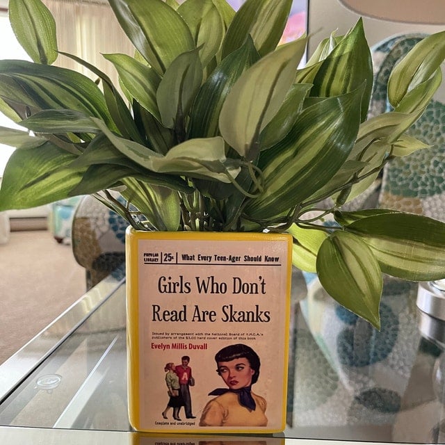 It is glazed on the interior and can be used as a vase. Great gift for a reader who appreciates a little snarky humor with her literature.